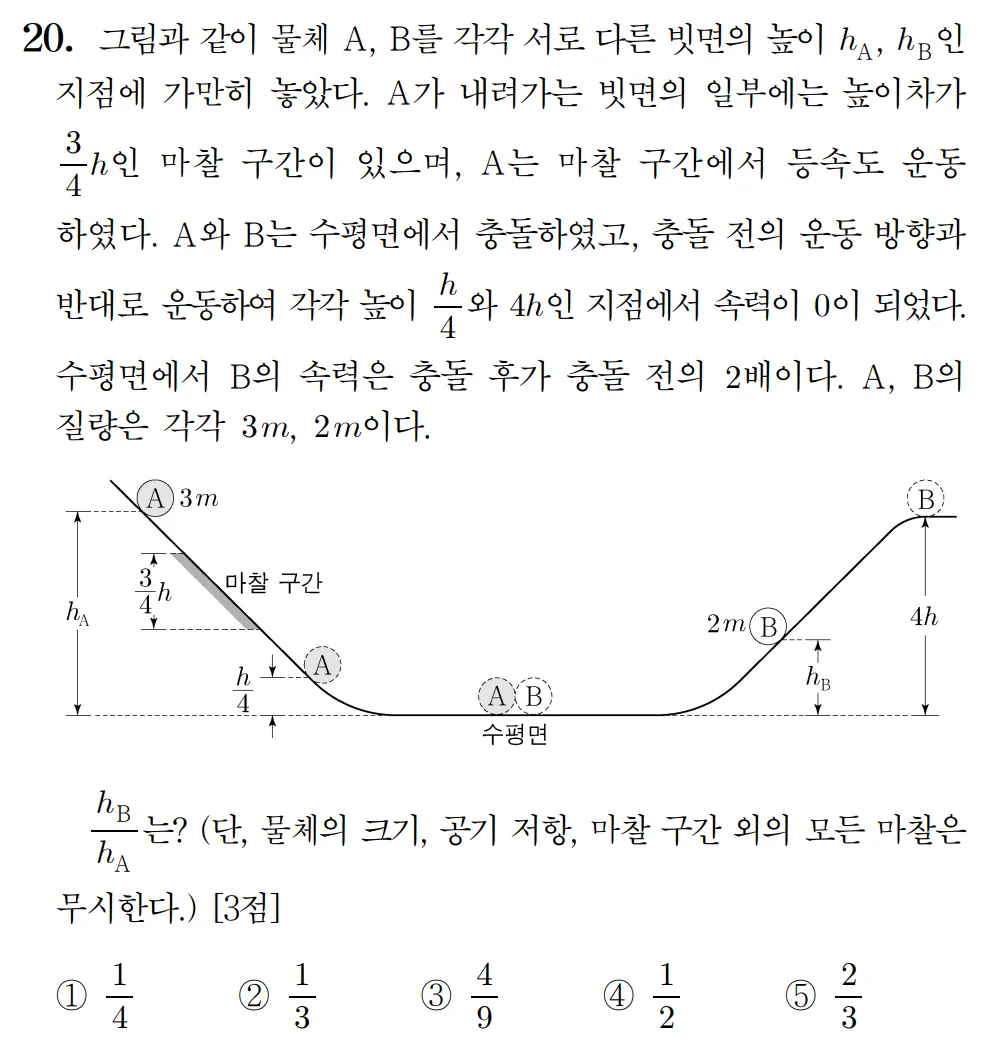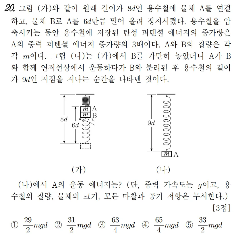 역학적 에너지 E는 30mgd이고 A와 B의 질량이 같으므로 각각 15mgd씩 나눠 가진다